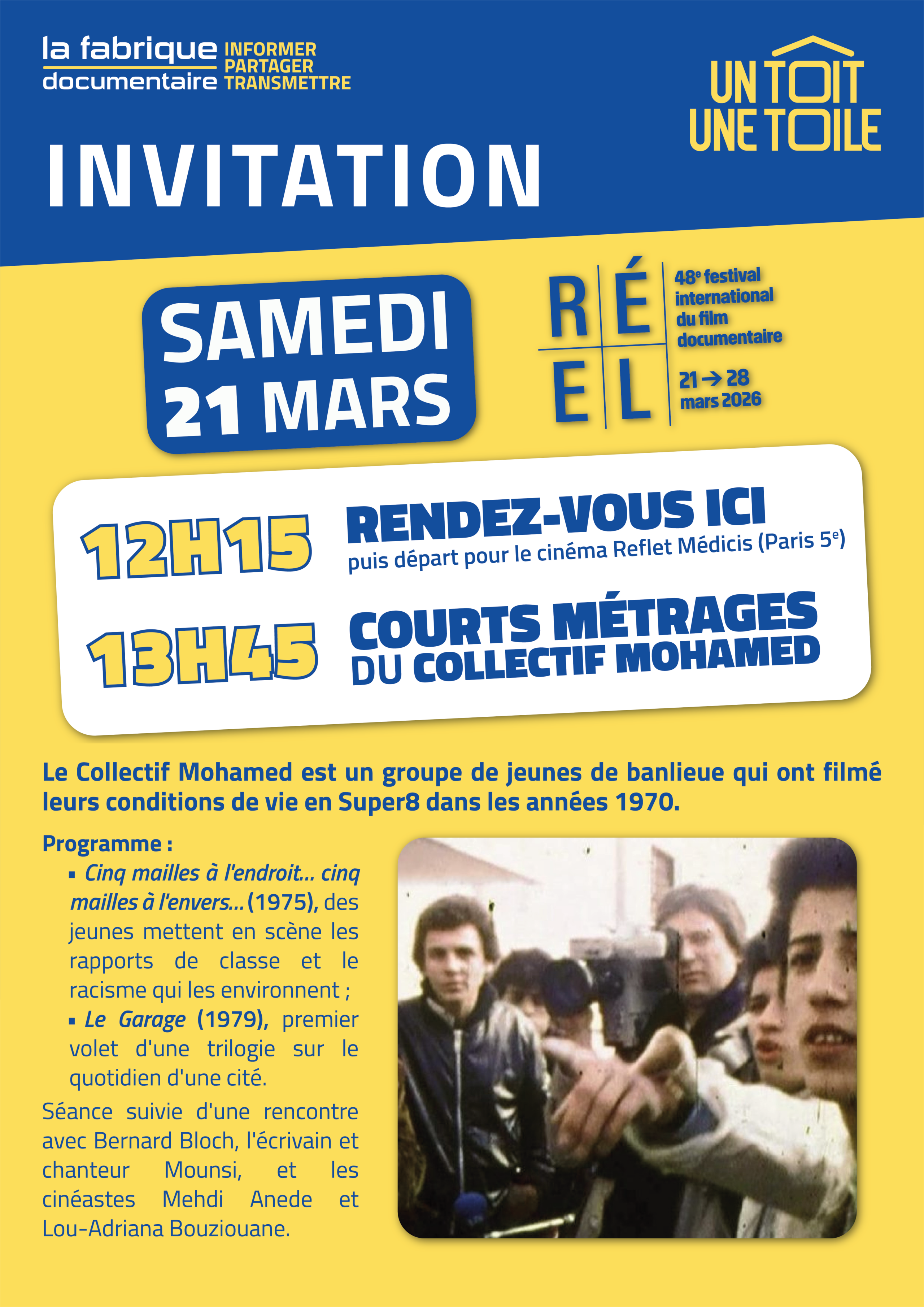 â le 21 mars 2026 au cinĂ©ma Le Reflet MĂ©dicis (Paris 5e), invitation des sans-abris au festival CinĂ©ma du RĂ©el (BibliothĂšque publique d’information / Centre Pompidou). Films du Collectif Mohamed : entre 1977 et 1981, des jeunes habitants des citĂ©s dâAlfortville et de Vitry-sur-Seine, se rĂ©unissent, se cotisent, achĂštent quelques bobines Super8 et tournent trois court-mĂ©trages avec le soutien dâun enseignant de leur lycĂ©e.
