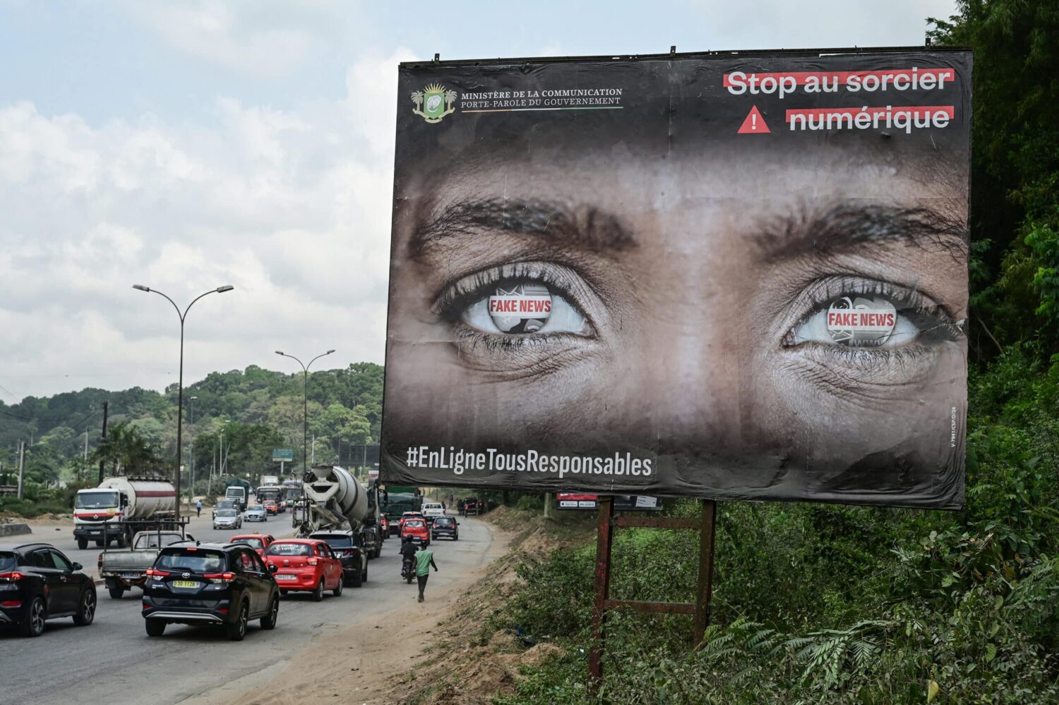 [Image : Affiche de sensibilisation contre la désinformation en bord de route à Abidjan, janvier 2025. © Sia Kambou / AFP]